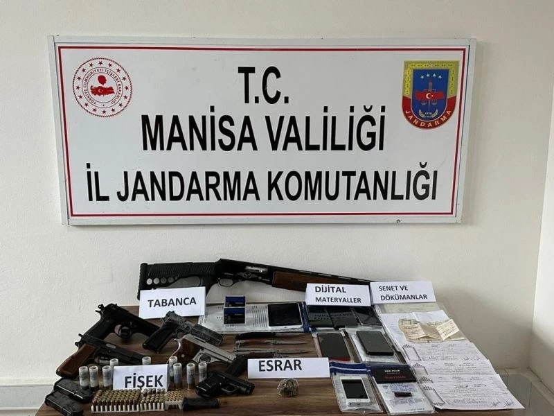 Şüphelilerin ikametlerinde yapılan aramalarda 5 adet tabanca, 1 adet otomatik tüfek, 91 adet tabanca fişeği, 4 adet şarjör, 4 adet kesici ve delici alet, 1 adet tablet, 5 adet cep telefonu, 8 adet sim kart, 1 adet flash bellek, 1 adet harddisk, 20 gram esrar ve toplamda 700 bin TL’lik senet, çeşitli dijital materyal ve yazılı dokümanlara incelenmek üzere el konularak adli işlem başlatıldı.