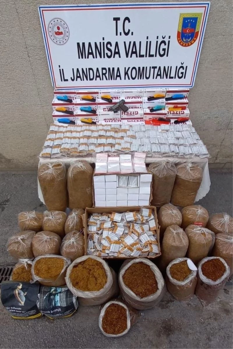 Manisa’nın Akhisar ilçesinde jandarma ekipleri tarafından düzenlenen operasyonda 4 bin 960 adet satışa hazır makaron sigara, 22 bin adet bandrolsüz boş makaron, 13 adet sigara sarma makinesi, 1 adet faturasız kuru sıkı tabanca, 160 kilogram kıyılmış tütün ele geçirildi.