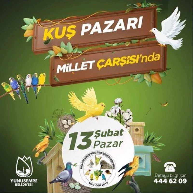 Yunusemre Belediyesi, Manisa Kıvrık Gagalılar ve Kafes Kuşları Sevenler Dayanışma Derneği ile birlikte 13 Şubat Pazar günü Yunus Emre Millet Çarşısı’nda Kuş Pazarı kuruyor.