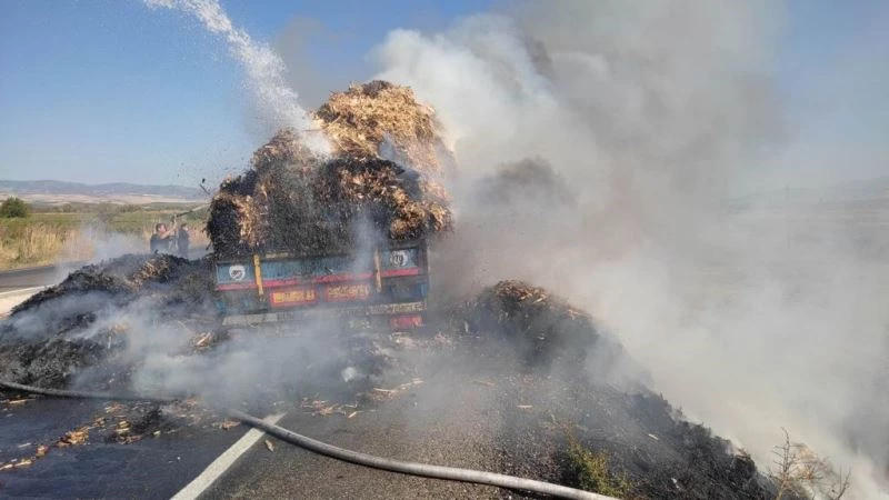 Manisa’nın Salihli ilçesinde seyir halindeki saman yüklü tırda meydana gelen yangın sonucu tır kullanılamaz hale geldi.