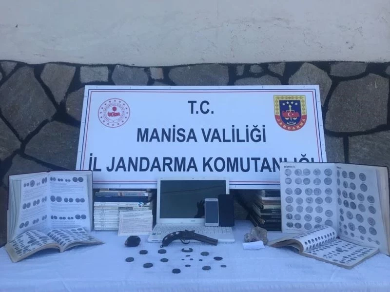 Manisa’nın Kula ilçesinde KOM Şube Müdürlüğü, İstihbarat Şube Müdürlüğü ve Kula İlçe Jandarma Komutanlığı ekipleri tarafından tarihi eser kaçakçılığı operasyonu düzenlendi. İlçeye bağlı Gökçeören Mahallesi’nde düzenlenen operasyonda H.K. isimli kişiye ait ev, iş yeri ve araçta arama yapıldı. Aramalarda Roma Dönemi’ne ait olduğu değerlendirilen değişik ebat ve büyüklükte 15 sikke, 1 adet bilezik, Roma dönemine ait 2 adet obje taş, 1 adet Osmanlı Dönemi’ne ait olduğu değerlendirilen tabanca, 64 adet tarihi eser bilgilerinin olduğu kitap ve doküman, 2 adet yurtdışı havale dekontu, 11 adet tarihi eser motiflerinin bulunduğu resim, 3 adet elle çizilmiş tarihi eser figürü, 1 adet el yazısı ile yazılmış hesap kağıdı, 1 adet Y.Z. Mahmut III. Ahmet ibareli not ve suç delillerinin yer aldığı değerlendirilen 1 adet laptop ele geçirildi.