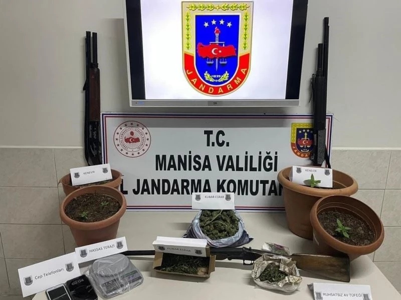 Manisa’nın Akhisar ilçesinde Akhisar İlçe Jandarma Komutanlığı JASAT (Jandarma Dedektifleri) tarafından yapılan istihbarı çalışma sonucu; C.M. ve K.S. isimli şahısların araç ile uyuşturucu madde ticareti yapacakları ve Akhisar - Gölmaramara Karayolu üzerinde seyir halinde oldukları bilgisine ulaştı. Seyir halindeki araç jandarma ekipleri tarafından durdurulurken yapılan operasyonda araç içerisinde 1 kilo 480 gram uyuşturucu madde tespit edilirken, Cumhuriyet savcısının talimatı ile şüpheli şahısların ikametgâhlarında yapılan aramada ise, 3 adet ruhsatsız av tüfeği, 19 gram kubar esrar, 4 adet saksıya ekili kenevir bitkisi, 4 adet fişek ve hassas terazi ele geçirildi. Şüpheliler adli makamlara sevk edilmek üzere gözaltına alındı.