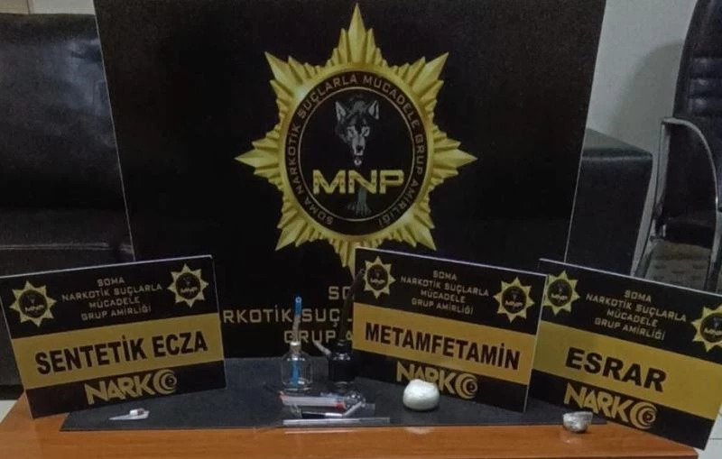 Manisa İl Emniyet Müdürlüğü Soma Narkotik Suçlarla Mücadele Büro Amirliği ekiplerince düzenlenen operasyonda durdurulan araç içindeki şahsın aracında ve evinde arama yapıldı. Yapılan aramalarda 34,15 gram metamfetamin, 1 adet sentetik hap, 1 gram esrar, 6 adet uyuşturucu içme aparatı ele geçirildi. Operasyonda uyuşturucu veya uyarıcı madde imal ve ticareti yapmak suçundan gözaltına alınan K.Ö. (51) ve İ.Ç. (37) çıkarıldığı mahkemece tutuklanarak cezaevine gönderildi.
