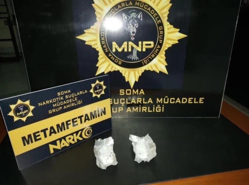 Manisa İl Emniyet Müdürlüğü Soma Narkotik Suçlarla Mücadele Grup Amirliği ekipleri tarafından takibe alınan şahıs durdurularak üst araması yapıldı. H.İ.A. (32) isimli şüphelinin yapılan üst aramasında 10 gram metamfetamin maddesi ele geçirildi. Uyuşturucu veya uyarıcı madde imal ve ticareti yapmak suçundan gözaltına alınan H.İ.A., emniyete götürüldü.