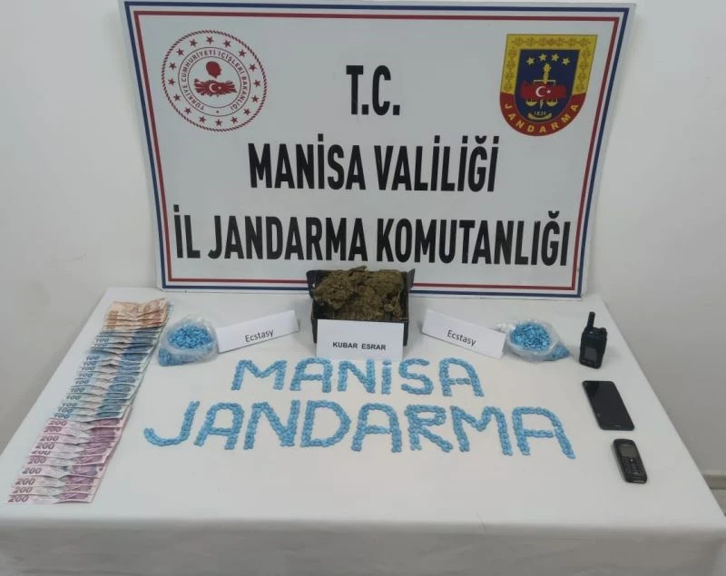 Manisa İl Jandarma Komutanlığı ile Yunusemre ilçe Jandarma Komutanlığı ekipleri, yürüttükleri istihbarat çalışmaları sonucu dün gece saatlerinde Manisa-İzmir yolu Sabuncubeli mevkiinde bir otomobile operasyon düzenledi. Otomobilde yapılan aramada; 2 bin adet ecstasy hap, 605 gram kubar esrar, 4 bin TL, 1 adet el telsizi, 2 adet cep telefonu ele geçirilirken, şüpheli Ü.P. (26) gözaltına alındı.