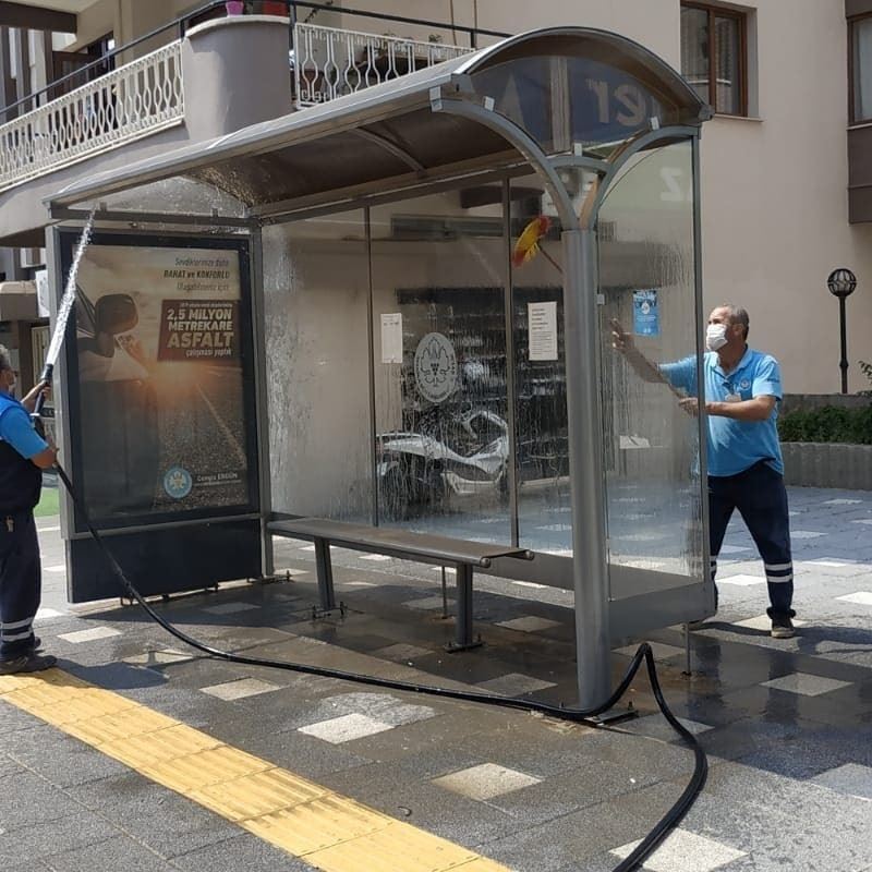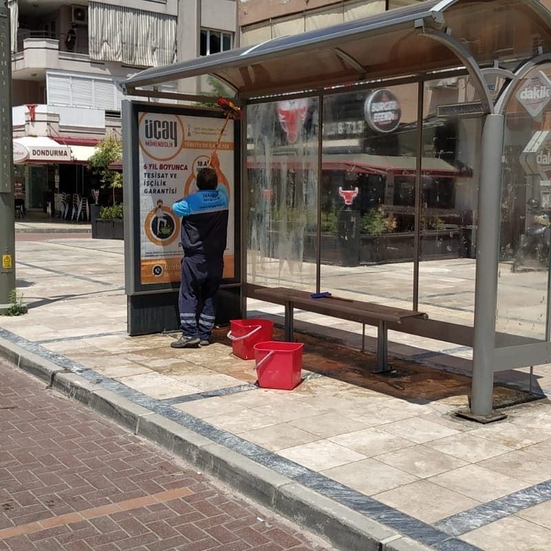 Manisa Büyükşehir Belediyesi, Salihli ilçesinde korona virüsle mücadele tedbirleri kapsamında otobüs duraklarına yönelik olarak hijyen ve temizlik çalışmaları gerçekleştirdi.