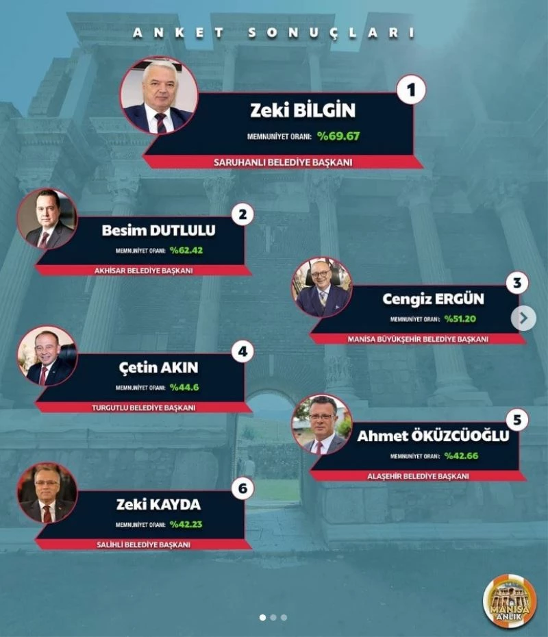Öte yandan aynı ankette yüzde 62,42 oyla Akhisar Belediye Başkanı Besim Dutlulu ikinci, yüzde 51,20 oyla Manisa Büyükşehir Belediye Başkanı Cengiz Ergün üçüncü oldu.