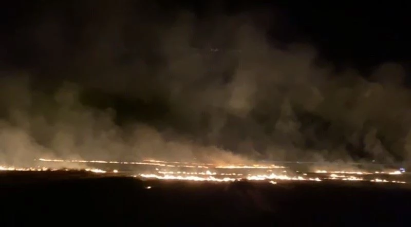 Mardin’in Artuklu ilçesinde buğday hasadının tamamlandığı bir tarlada henüz bilinmeyen nedenle yangın çıktı. Kısa sürede rüzgarın etkisiyle diğer tarlalara da sıçrayan yangın gecenin karanlığını aydınlığa çevirdi.