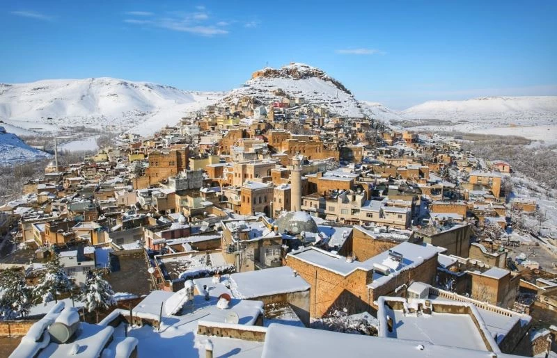 Mardin’de karla birlikte tarihi yapılar beyazla süslendi