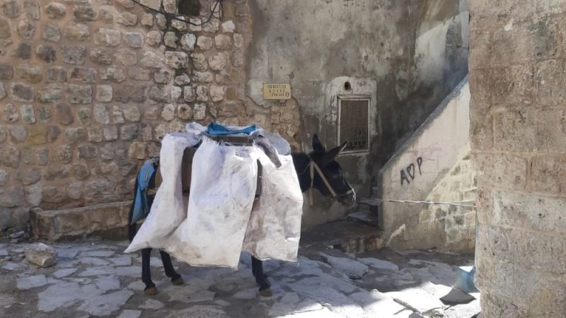 Tarihi dokusu ile yerli ve yabancı turistlerin en çok ziyaret etmek istediği illerin başında gelen yaklaşık 7 bin yıllık geçmişi bulunan Mardin’de araçların giremediği dar ve merdivenli sokakların temizliği kadrolu eşekler tarafından yapılıyor. İçişleri Bakanlığınca cuma akşamı 21.00 itibarı ile başlatılan ve pazartesi günü saat 05.00’e kadar devam edecek olan 56 saatlik sokağa çıkma kısıtlamasında belediye ekipleri araçlarla cadde ve sokaklardaki çöpleri temizlerken, kadrolu eşekler de araçların giremediği dar ve merdivenli sokaklarda mesailerini sürdürüyor. Yanlarındaki görevlilerle birlikte dar sokaklarda çöpleri yüklenen kadrolu eşekler, gün boyu kentin temizliğinde görev alıyor.