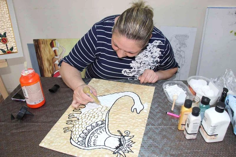 Mardin’de en bilinen mitolojik karakterlerden biri olan Şahmeran, çeşitli malzemelerle motiflere dökülerek yaşatıldı. Bakır plaka, cam, ayna, altın, gümüş, kumaş ve birçok maddenin üstüne işlenen Şahmeran, şimdi ise yumurta kabuğu ile kontrplağın üzerinde şekillenerek tablo haline getirildi. Artuklu Halk Eğitim Merkezinde usta öğretici Sevgi Aktolon tarafından yapılan tablolar, görenlerin ilgisini çekiyor. Yumurta kabuğunu geri dönüşüm yoluyla toprağın üzerinde tabloya dönüştüren Aktolon, yaptığı bu işi öğrencilerine de öğretiyor. 7 senedir Halk Eğitim Merkezi Müdürlüğü bünyesinde çalıştığını söyleyen Aktolon, “İlk önce şapka dikimi kursuyla başladık. Daha sonra makine nakışları işledik ve unutulmaya yüz tutmuş mesleklerle devam ettik. Şimdi de ahşap boyama kursumuzla devam ediyoruz. Sıfır atık ve geri dönüşümden yola çıkarak böyle bir projeye dahil olduk. Yumurta kabuğundan tablolar yapıyoruz” dedi.