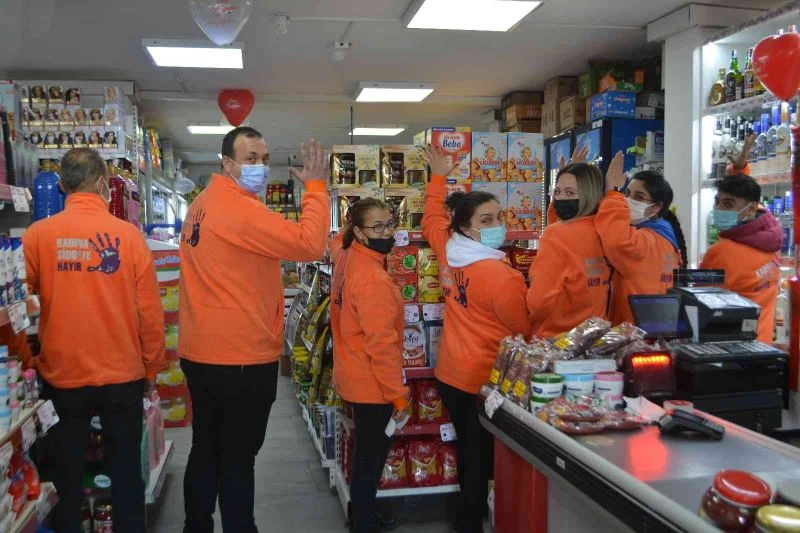 Çoğunluğu kadınlardan oluşan market personeli, üzerinde “Kadına Şiddete Hayır” yazılı sweatshirtlerle müşterilerine hizmet veriyor.