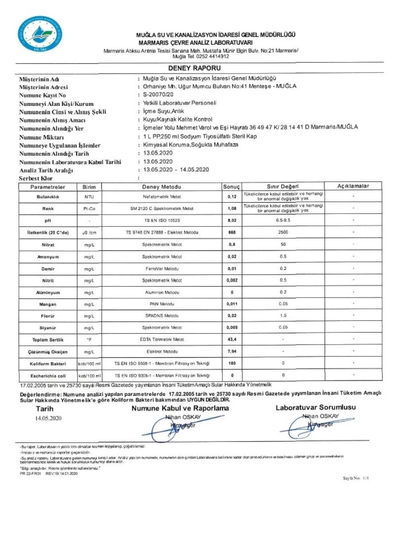 14 Mayıs’ta alınan örneklerin değerlendirmesinde Sekine Evren Çeşmesi’yle ilgili olarak “Numune analizi yapılan parametrelerde 17.02.2005 tarih ve 25730 sayılı Resmi Gazete’de yayımlanan İnsani Tüketim Amaçlı Sular Hakkında Yönetmeliğe göre PH bakımından uygun değildir” sonucu çıktı. Diğer kaynak sularının ise aynı yönetmeliğe göre koliform bakteri bakımından tüketime uygun olmadığı değerlendirmesi yapıldı.