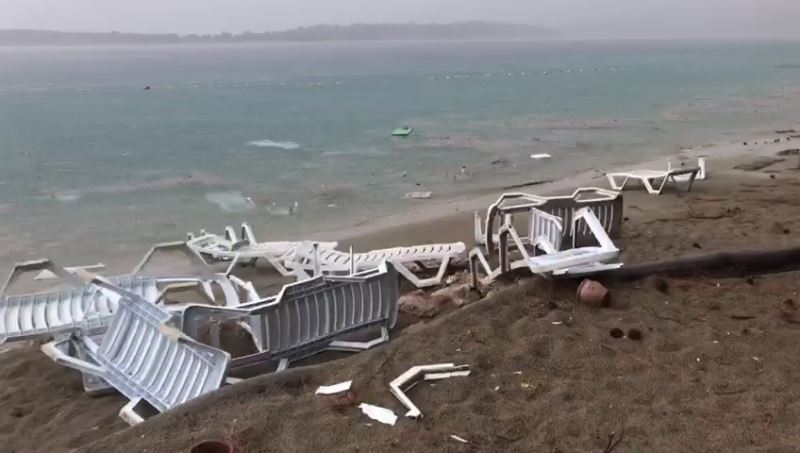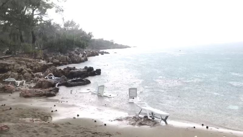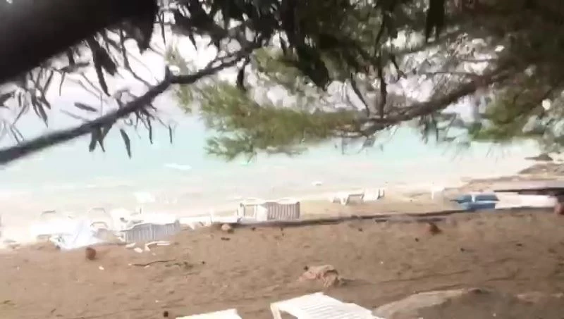 Muğla’nın Marmaris ilçesinde zaman zaman etkili olan sağanak yağış sonrası oluşan hortum, plajdaki masaları devirdi, şezlongları parçaladı.