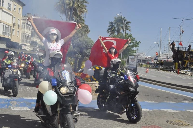 Marmaris İlçe Emniyet Müdürlüğüne bağlı balonlar ve Türk bayrakları ile süslenmiş tüm resmi ekip otoları ve motorize ekipler Emniyet Müdürlüğü binasından sirenler ve çocuk marşları ile Marmaris’i gezdiler. Deniz poliside denizde daireler çizerek şov yaptı. Kısıtlama dolayısı ile alışveriş için sokağa çıkan vatandaşlar cep telefonları ile bu görüntüyü kaydetti.