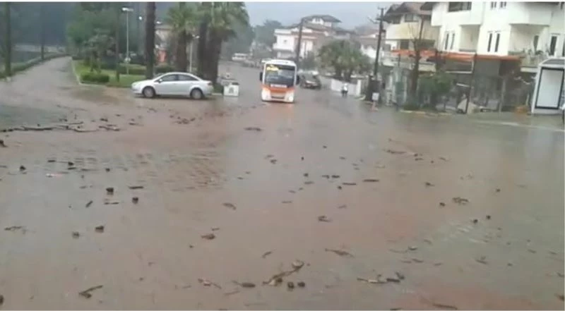 Muğla’nın Marmaris ilçesinde sabah saatlerinden itibaren etkili olan sağanak yağış hayatı olumsuz etkiledi. Oluşan sel suları yolları göle çevirdi.