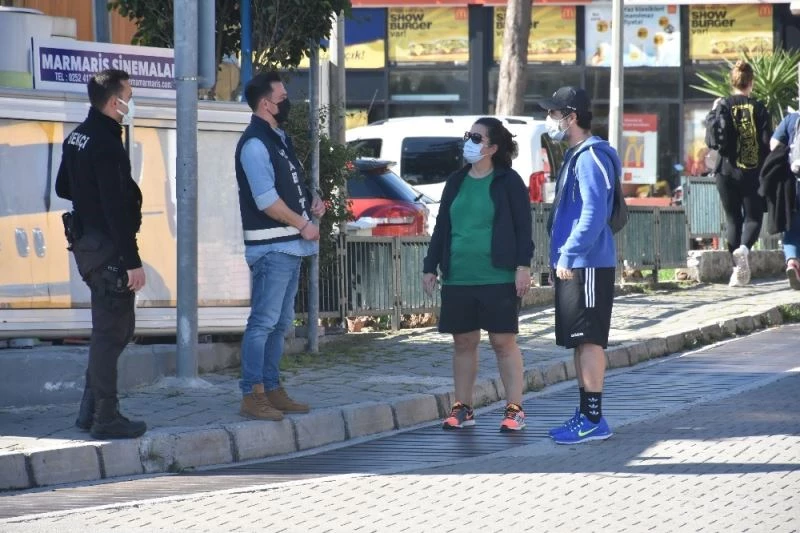 Marmaris İlçe Emniyet Müdürlüğü ve Marmaris Hıfzıssıhha Kurulu ekipleri Yat Limanı, Kordon Caddesi ve Atatürk Caddesi’nden turistik İçmeler mahallesine kadar uzanan 11 kilometrelik sahil yolu ile plajlarda denetim yaptı. Genelgeden haberdar olmayan vatandaşlar uyarılarak sahil yollarından uzaklaştırıldı. Sokağa çıkma kısıtlaması ve yasaktan muaf tutulan yabancı uyruklu kişiler sahil yolunda yürüyüş yaptı, bisiklet sürdü, güzel havanın tadını çıkardı.