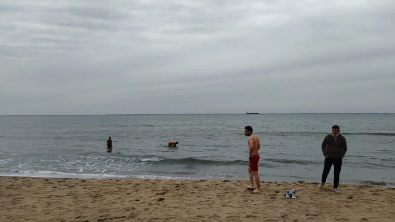 Bartın’ın İnkumu sahiline gezmek için gelen bir grup genç soğuk havaya aldırmadan denize girdi.