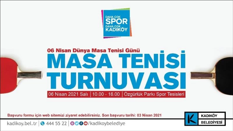 Kadıköy Özgürlük Parkı “Dünya Herkes İçin Masa Tenisi Günü” kutlamaları kapsamında Kadıköy Belediyesi Gençlik ve Spor Hizmetleri Müdürlüğü tarafından düzenlenen masa tenisi turnuvasına ev sahipliği yapıyor. 6 Nisan Salı günü saat 10.00 - 16.00 saatleri arasında gerçekleşecek turnuvada rakiplerin heyecanlı çekişmesi görkemli ve eğlenceli görüntülere sahne olacak. Düzenlenen turnuvaya masa tenisine gönül vermiş antrenörlerin bir araya gelerek kurduğu Table Tennis Organizations (TTO) da ödül ve raketleri temin ederek destekte bulunuyor.