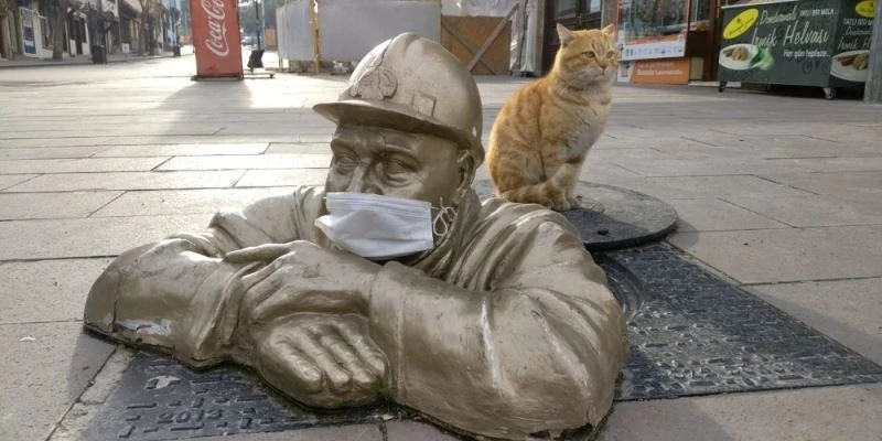 Korona virüsle mücadelede farkındalık oluşturmak adına bazı vatandaşlar tarafından işçi heykeline maske takıldı. Tarihi Odunpazarı Bölgesi’nde bulunan heykelin maskeli olması görenleri hem gülümsetti hem de şaşırttı. Şehrin en çok ziyaret edilen ve kalabalık yerlerinden biri olarak öne çıkan tarihi bölgede, heykeller aracılığıyla maske kullanımına dikkat çekildi. Virüse karşı en önemli tedbirlerden biri olan maskenin heykellerde de yer alması, kurallara uymayanlara da ders niteliğinde olduğu belirtildi.