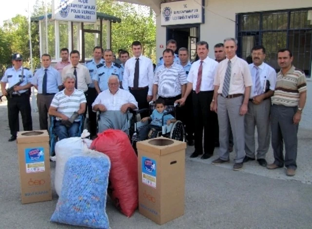 Osmaniye?nin Sumbas ilçesinde ?1 kapak 1 umut? projesi kapsamında kaymakamlık ve emniyet müdürlüğü tarafından toplanan 50 bin kapakla, iki engelli tekerlekli sandalyeye kavuştu.Kaymakam Selçuk Yosunkaya, Osmaniye Engelliler Platformu?nun başlattığı kampanyada alınan tekerlekli sandalyeleri emniyet müdürlüğü bahçesinde düzenlenen törenle sahiplerine teslim etti. Kaymakam Yosunkaya, insanların kendi yaşamını sürdürmesi dışında topluma karşı da bir sorumluluğu olduğunu vurguladı. İhtiyaç sahiplerine yardımcı olunması gerektiğini aktaran Yosunkaya, ?Bu bir vazife ve toplumsal bir görevdir. Gönüllülük esasıyla başlatılan kampanyaya bugüne kadar ilçedeki tüm kamu kurum ve kuruluşları ile duyarlı vatandaşlarımız büyük destek vermişlerdir. Emeği geçen herkese teşekkür ediyorum." dedi.Osmaniye Engelliler Platformu Başkanı Haydar Aktürk ise başlattıkları ?1 kapak 1 umut? kampanyasına her kesimden desteklerin geldiğini belirterek, ?Kampanyamız devam ediyor. Elimize geçen mavi kapaklarla özürlülerimizi sevindirmeyi sürdüreceğiz.? diye konuştu.Akçataş köyünden 6 yaşındaki Ümit Karabulut ve Mehmetli beldesinden 80 yaşındaki Ümmet Eyvaz`a tekerlekli sandalyelerin verildiği programa, İlçe Milli Eğitim Şube Müdürü Cengiz Akdağ, Osmaniye 7 Ocak Engelliler Spor Kulübü Derneği Başkanı Muttalip Altun ve engellilerin aileleri katıldı.