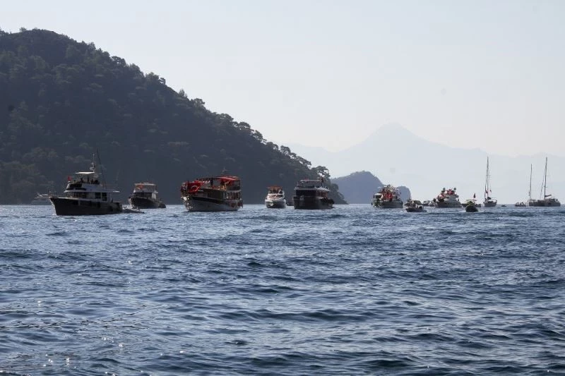 Tekneler korna ve marşlar eşliğinde Göcek açıklarında tören geçişi yaptı. Teknelerde bulunan vatandaşlar da ellerinde Türk bayraklarıyla çalan marşlara eşlik etti.