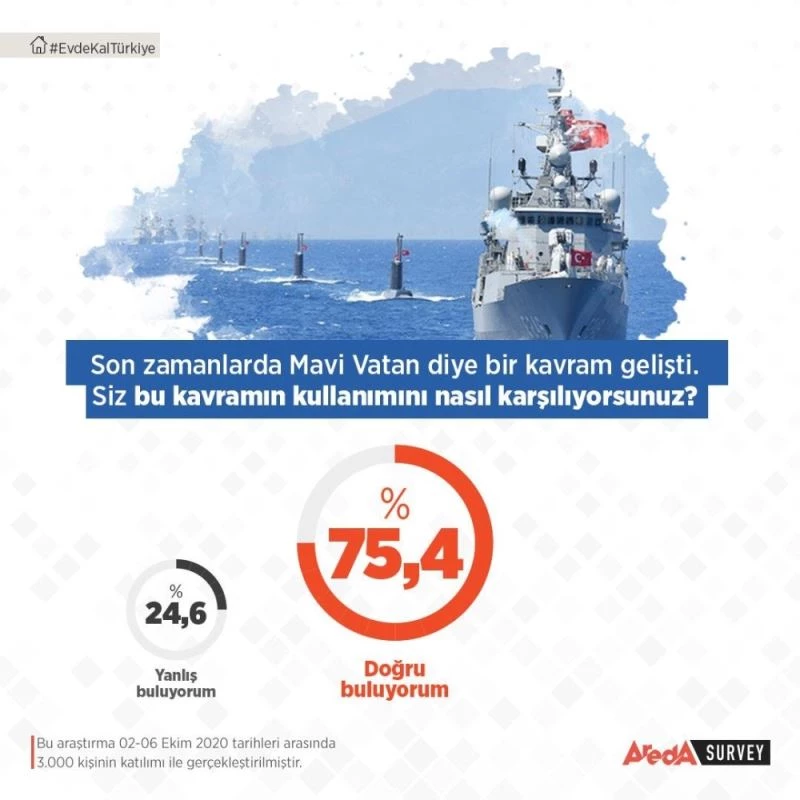Araştırma Şirketi Areda Survey’in Eylül ayındaki güncel konuları içeren Sosyometre Araştırması önemli sonuçları ortaya koydu. Türkiye genelini temsil eden 3 bin kişiyle yapılan araştırmaya göre, Türkiye’nin Doğu Akdeniz ve Ege’de iddia ettiği haklara sahip olduğunu düşünenlerin oranı yüzde 86,1 oldu. Araştırmaya göre Mavi Vatan kavramının kullanımını doğru bulan katılımcıların oranı yüzde 75,4 olarak belirlendi.