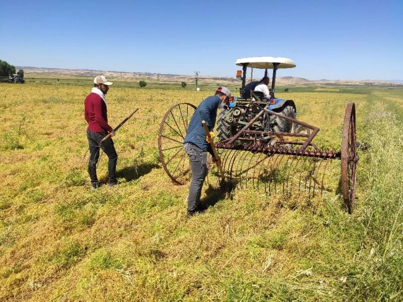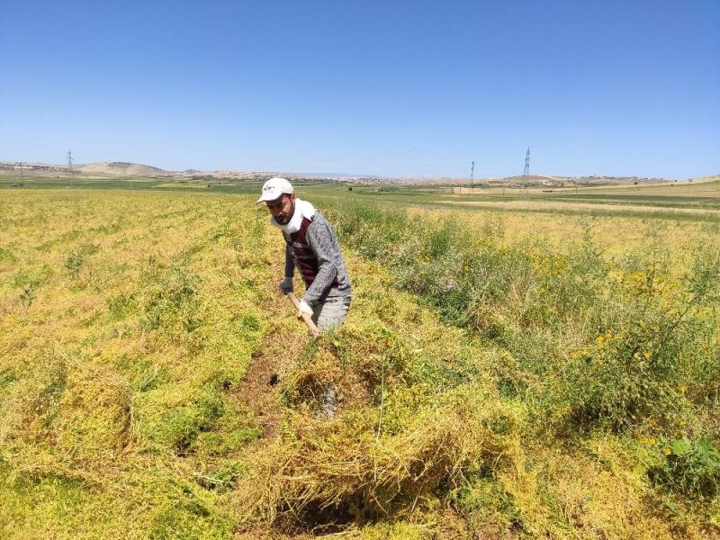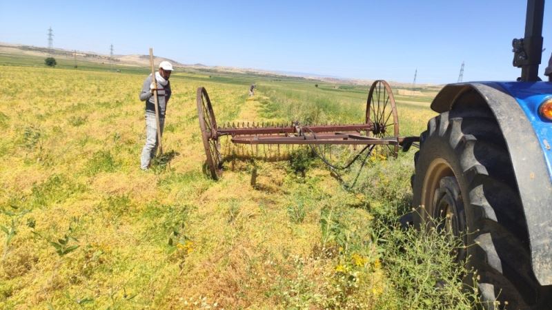 Mardin’in Mazıdağı ilçesinde çiftçiler, havaların ısınması ile birlikte mercimek hasadına başladı.