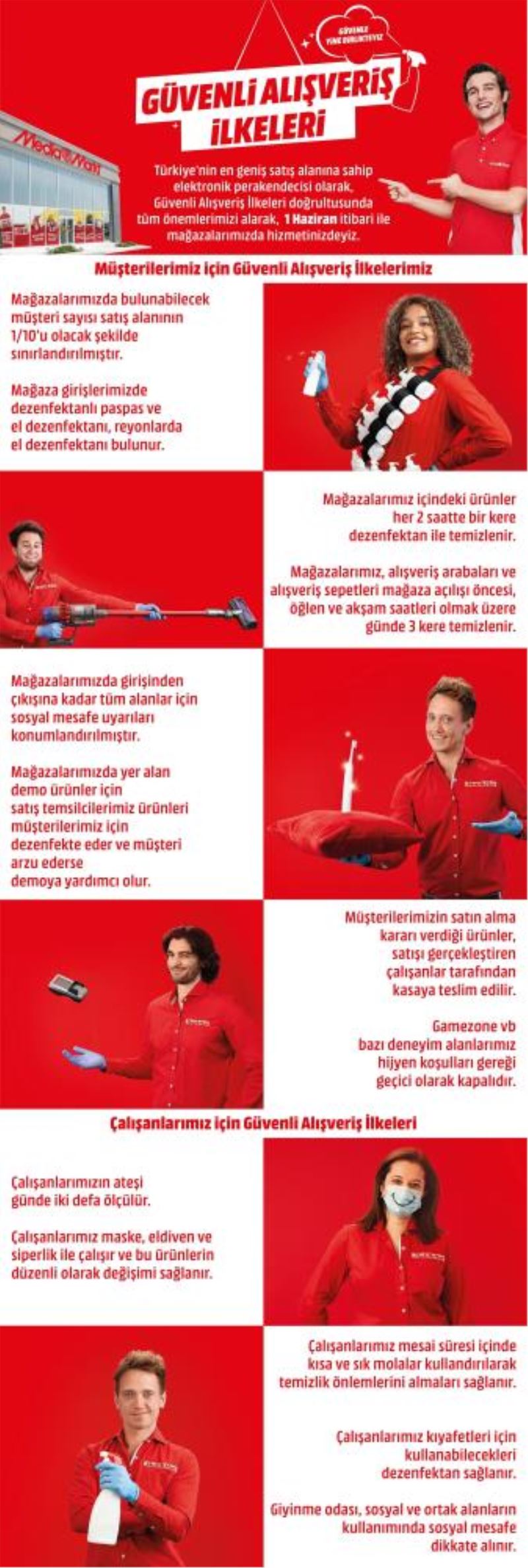 MediaMarkt Türkiye, çalisanlarinin ve teknolojiseverlerin sagligini koruyarak, onlarin elektronik ürün ihtiyaçlarini konforlu bir sekilde karsilayabilmek için de "Güvenle yine birlikteyiz" diyerek çesitli önlemler aldi. Bu önlemler çerçevesinde magaza içerisini tekrar dekore eden MediaMarkt Türkiye, aldigi tedbirleri ise müsterileri, çalisanlari ve magaza içi olmak üzere 3 farkli baslik altinda topladi.