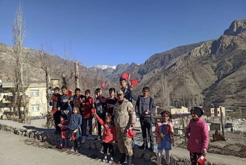 Şırnak’ın Uludere ilçesine bağlı Şenoba ve Hilal Jandarma Karakol Komutanlığı ekipleri, çocuklara Türk bayrağı, kek ve meyve suyu dağıttı.