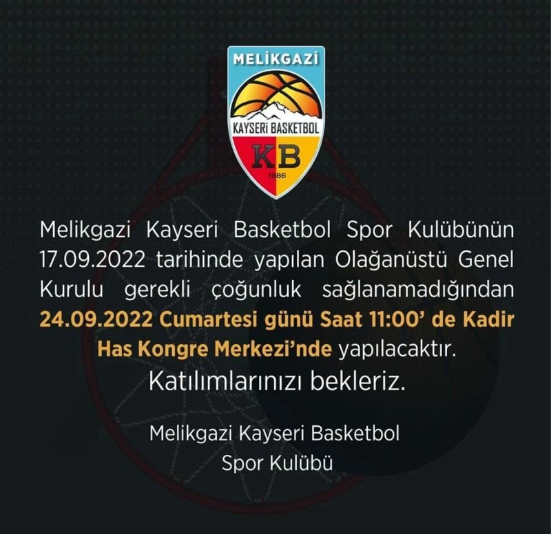 Melikgazi Kayseri Basketbol Kulübünden yapılan açıklamada; “Melikgazi Kayseri Basketbol Spor Kulübü’nün 17.09.2022 tarihinde yapılan Olağanüstü Genel Kurulu gerekli çoğunluk sağlanamadığından 24.09.2022 Cumartesi günü saat 11.00’de Kadir Has Kongre Merkezi’nde yapılacaktır. Üyelerimizin katılımlarını bekleriz” ifadeleri kullanıldı.