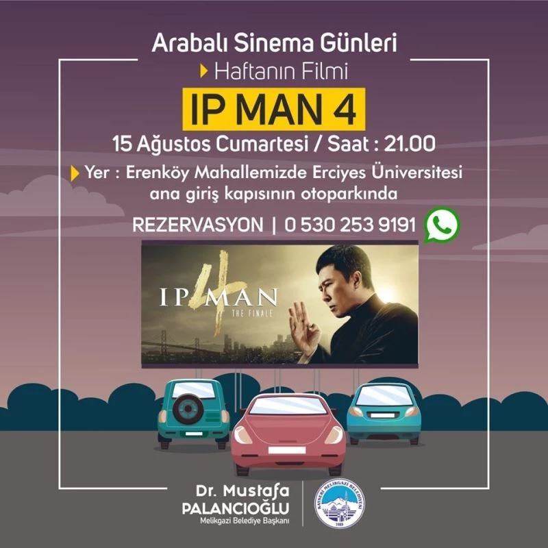 “Bizler bu zorlu süreçte vatandaşlarımıza farklı kültürel ve sosyal etkinlikler düzenliyoruz. Etkinliklerimize Melikgazili hemşerilerimiz ile buluşturmaya devam edeceğiz. Büyük ilgi gören açık hava arabalı sinema etkinliğimizi vatandaşlarımız çok sevdi. Filmlerin seslerinin kapalı devre radyo sistemi ile dinlenebildiği etkinlikte vatandaşlarımız araçlarından inmeden film izliyor. Bizde belediye olarak, çay, mısır ve dondurma ikram ediyoruz. Arabalı Sinema günlerinde bu hafta ’lP MAN 4’ filmi gösterimde olacak. 15 Ağustos 2020 Cumartesi günü saat 21.00’de Erenköy Mahallesinde Erciyes Üniversitesi Ana Giriş Karşısı Otopark Alanında gerçekleştireceğimiz etkinliğimize tüm sinemaseverleri bekliyoruz.”