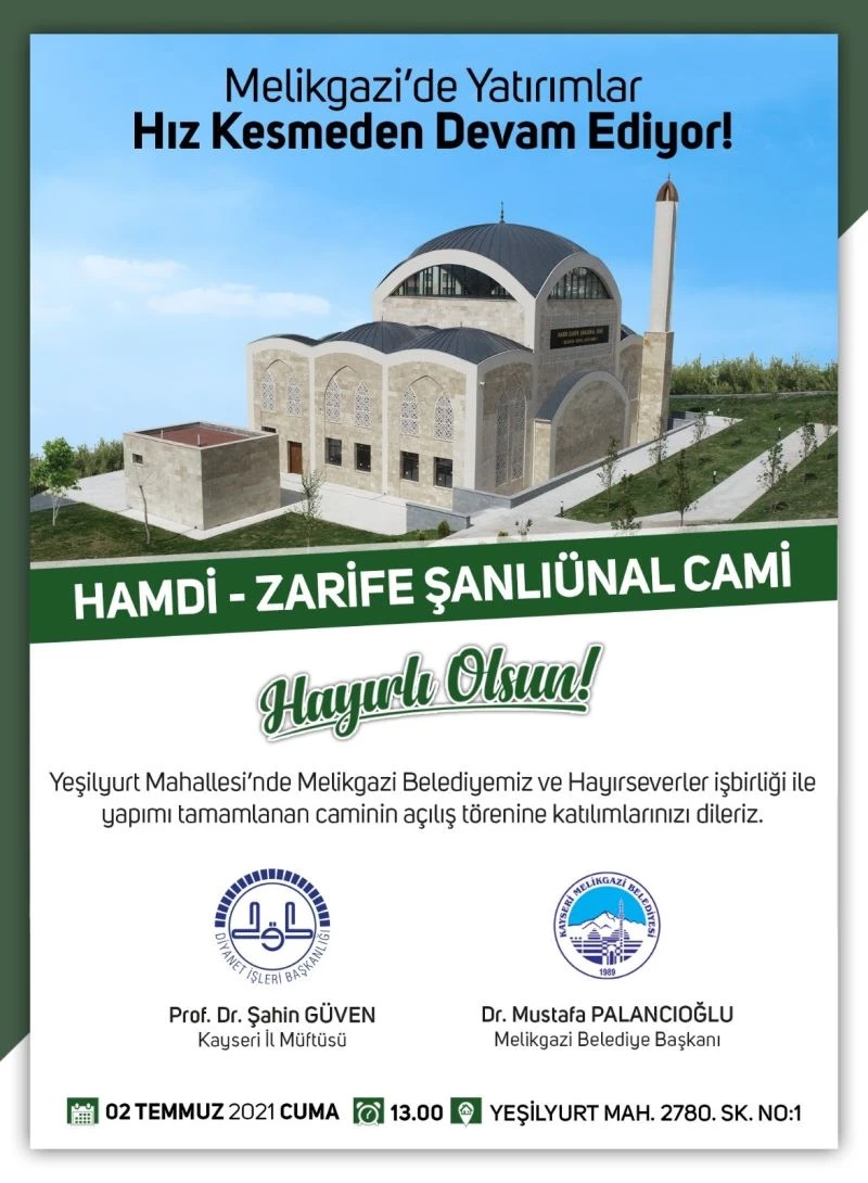 Melikgazi Belediyesi, Tınaztepe Mahallesi’nde Hayırsever Sarıalp ailesiyle birlikte yaptığı Ahmet-Selehattin Sarıalp Aile Sağlığı Merkezi ve Yeşilyurt’ta yine Melikgazi Belediyesi ve hayırsever işbirliği ile yapımı tamamlanan Hamdi-Zarife Şanlıünal Cami’nin 2 Temmuz Cuma günü açılışını yapacak.