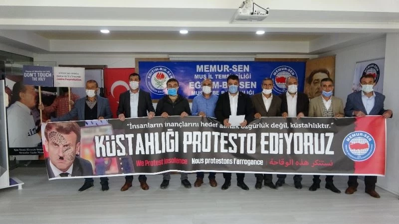 Peygamberim Efendimize hakaret eden karikatürleri Fransa’da kamu binalarına yansıtan Fransa Cumhurbaşkanı Macron, İslam karşıtlığını tırmandırmaya devam ederken, Memur-Sen de ‘İnsanların inançlarını hedef almak özgürlük değil, küstahlıktır’ diyerek Fransa’yı ve Macron’u protesto etti. Sendika binasında gerçekleştirilen basın açıklamasında konuşan Memur-Sen ve Eğitim-Bir-Sen Muş İl Başkanı Mahir Barışan, inançlarını ve değerlerini koruyacaklarını söyledi. Fransa’yı sömürgenin merkezi olarak tanımlayan Başkan Barışan, "Sömürgenin merkezlerinden olan Fransa Cumhurbaşkanı Emanuel Macron, son birkaç zamandır cinnete esir politikalarına bir yenisini ekleyerek, insanlığa rahmet olarak gönderilen, hatem-ül enbiya Hazreti Muhammed Mustafa’ya ilişkin sözde karikatürlere fikir özgürlüğü adına sahip çıkması ve Müslümanları aşağılamasını telin etmek için burada toplandık" dedi.