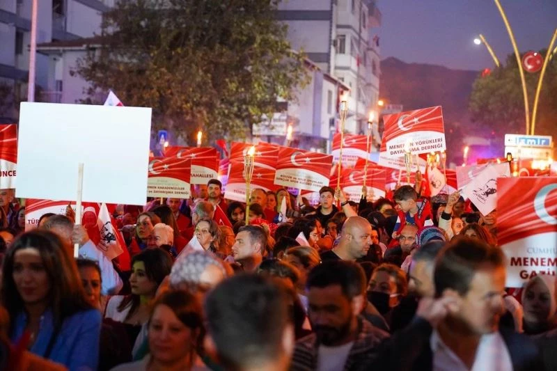 Cumhuriyet Bayramı’nın 99. yıl dönümü, Menemen’de görkemli cumhuriyet yürüyüşü ile kutlandı. Yaklaşık 29 bin kişinin ellerinde meşale ve bayraklarla katıldığı yürüyüşte; Menemen Belediye Başkan Vekili Aydın Pehlivan, eşi, kızı ve belediye ailesi hemşehrilerini selamladı. Pehlivan, “Gazi Mustafa Kemal Atatürk’ün ‘En büyük eserimdir’ dediği cumhuriyet, Türk ulusuna bırakılmış en değerli miras ve vazgeçilemez bir kazanımdır. Cumhuriyetimizin 100’üncü yılında Menemen, projelerimizle konuşulacak” dedi.