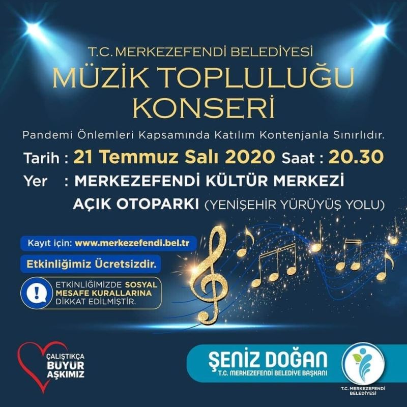 Merkezefendi Belediye Başkanı Şeniz Doğan, “Tüm tedbirlere uygun olarak düzenleyeceğimiz konserle, hemşerilerimizin yaşadığı stresi azaltmak istiyoruz. Bugün Saat 20.30’da, Merkezefendi Belediyesi Müzik Topluluğumuz, Merkezefendi Kültür Merkezi Açık Otoparkı’nda değerli hemşerilerimize unutulmayacak bir konser verecek. Konserimize hemşerilerimizi bekliyorum” dedi.