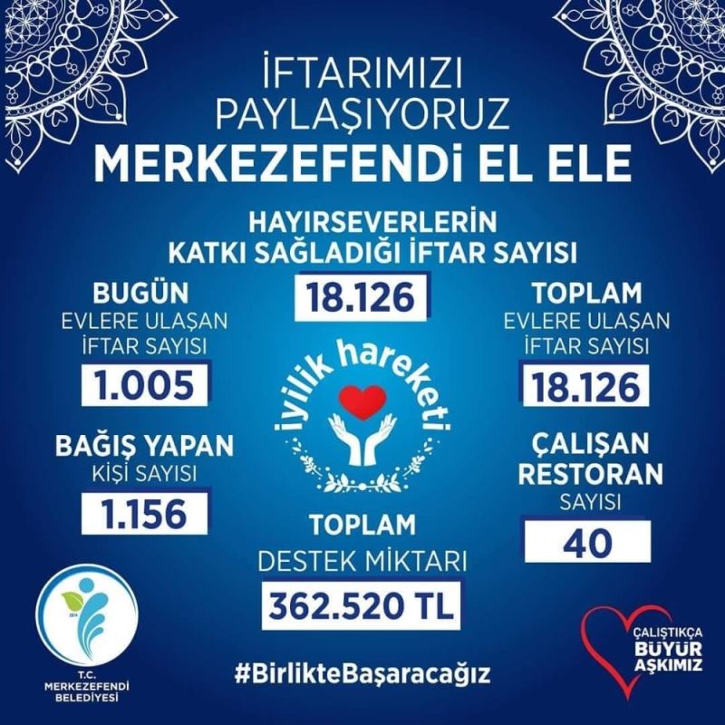 Merkezefendi Belediye Başkanı Şeniz Doğan, iyilik hareketinin amacına ulaşmasından dolayı duyduğu memnuniyeti dile getirdi. Başkan Doğan, “Hem ihtiyaç sahiplerine hem de ekonomik sıkıntı yaşayan esnafa can suyu olmak amacıyla başlatmış olduğumuz ‘Merkezefendi El Ele’ iyilik hareketi amacına ulaşmış durumda. İyilik hareketimizle bin 156 hayırsever destekçimiz, 362 bin 520 TL tutarında destek sağlayarak, 18 bin 126 iftarı ihtiyaç sahiplerine ulaştırdı. ‘Merkezefendi El Ele’ iyilik hareketimize ülkemizin dört bir yanından ve yurt dışından destek sağlayan hayırseverlerimize ve bu büyük dayanışmaya katılan Merkezefendimizdeki 40 restoranımıza sonsuz teşekkürler. Merkezefendi’de iyilik kazandı. Birlik ve beraberliğin yenemeyeceği güçlük yoktur” dedi.