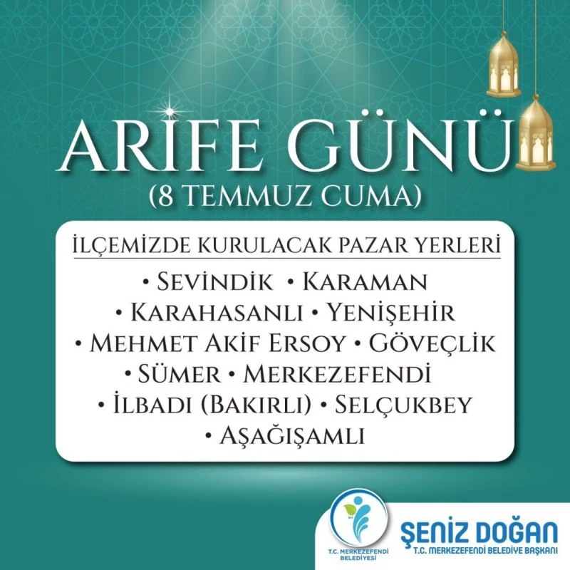 Merkezefendi Belediyesi tarafından 8 Temmuz Cuma günü kurulacak olan Sevindik, Merkezefendi, Karaman, Karahasanlı, Yenişehir, Mehmet Akif Ersoy, Göveçlik, Sümer, İlbade (Bakırlı), Selçukbey ve Aşağışamlı Kapalı Pazar Yerleri bayram öncesi alışveriş yapmak isteyenler için hizmet verecek. Belirlenen pazar yerlerinin haricinde farklı pazar yerine tezgah açmak isteyen esnafa izin verilmeyecek. Belirtilmiş olan pazar yerlerinde yeri olan esnaflar, kendilerine ait olan yerlerde tezgah açacak tezgah yeri olmayan esnaflara ise tezgah açtırılmayacağı belirtildi.