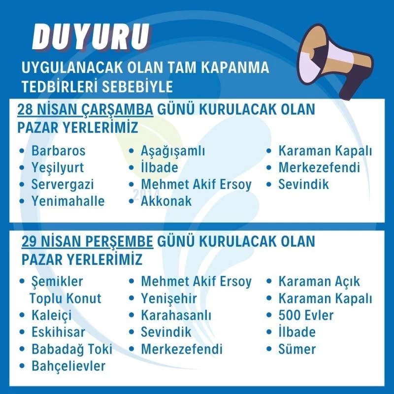 Merkezefendi Belediyesi uygulanacak olan tam kapanma tedbirleri sebebiyle pazar yerlerinin gününü değiştirdi. Pazar yerleri 28 Nisan ve 29 Nisan’da kurulacak. Yapılan program kapsamında 28 Nisan Çarşamba günü Barbaros, Yeşilyurt, Servergazi, Yenimahalle, Akkonak, Aşağışamlı, İlbade, Mehmet Akif Ersoy, Karaman Kapalı, Merkezefendi ve Sevindik pazar yerleri, 29 Nisan Perşembe günü ise Şemikler Toplu Konut, Kaleiçi, Eskihisar, Babadağ TOKİ, Karaman Kapalı, Karaman Açık, Bahçelievler, 500 Evler, İlbade, Sümer, Mehmet Akif Ersoy, Yenişehir, Karahasanlı, Sevindik ve Merkezefendi pazar yerleri hizmet verecek.