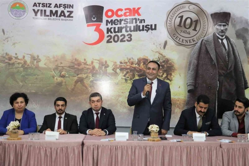 Toroslar Belediye Başkanı Atsız Afşın Yılmaz, mahalle muhtarlarıyla bir araya gelerek 3 Ocak programını paylaştı. Yunus Emre Kültür Merkezi’nde gerçekleşen toplantıda 101 yıl önce Mersin’deki milli mücadelenin destansı hikayesini anlatan Başkan Yılmaz, "3 Ocak Mersin’in Düşman İşgalinden Kurtuluşu’nun 101. yılı. Bugün yine aynı şey olsa İngilizler, Fransızlar Mersin Limanı’na çıkarma yapsalar, askerler gelse, bayraklar değişse eminim buradaki herkes aynı heyecanla vatan savunması için bir araya gelir ve düşmanı buradan atarız Allah’ın izniyle. O günkü ruhu bugün de yaşamak mecburiyetindeyiz. Ve bunu anlamak, anlatmak, çocuklarımıza aktarmalıyız. Bizim Türkiye olarak milli silahlarımız ve en önemlisi vatan savunması yapacak irademiz var. Dünyanın en güçlü silahlı kuvvetlerine sahibiz. Bir başka gücümüz ise genç ve dinamik nüfusumuzdur. Enerji tedarikiyle de bambaşka bir Türkiye ortaya çıkacak önümüzdeki günlerde ve hep beraber bunu yaşayacağız inşallah” diye konuştu.