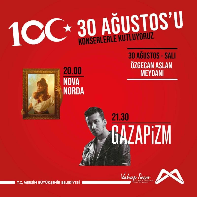Büyükşehir Belediyesi, 30 Ağustos tarihinden önce başlayacak olan ve haftaya yayılacak programlara, Mersinli vatandaşları davet ediyor. Birçok sanatsal ve sportif etkinliklerle 30 Ağustos coşkusuna yakışır etkinlikler düzenleyecek olan Mersin Büyükşehir Belediyesi sayesinde, Mersinliler zafer coşkusunu doya doya yaşayacak. Zafer Bayramı etkinlikleri çerçevesinde ilk olarak Büyükşehir Belediyesi Kültür ve Sosyal İşler Dairesi Başkanlığı tarafından, 26 Ağustos Cuma günü saat 20.30’da Özgecan Aslan Meydanı’nda özel bir etkinlik düzenlenecek. ‘Zafere Doğru 100. Yıl Oratoryosu’nda, Büyükşehir Belediyesi Sanat Toplulukları’nın oluşturduğu orkestra ve tiyatro sanatçıları, büyük zaferin tarihsel sürecini aryalar, napolitenler ve türküler eşliğinde sahneleyecek. 30 Ağustos Zafer Bayramı günü de saat 20.00’de yine Özgecan Aslan Meydanı’nda Nova Norda konseri ve ardından aynı yerde saat 21.30’da Gazapizm konseri ile 30 Ağustos coşkusu taçlanacak. Yine 30 Ağustos’ta Mut Kozlar Yaylası’nda Kültür ve Sosyal İşler Dairesi Başkanlığı koordinesinde konser düzenlenecek.