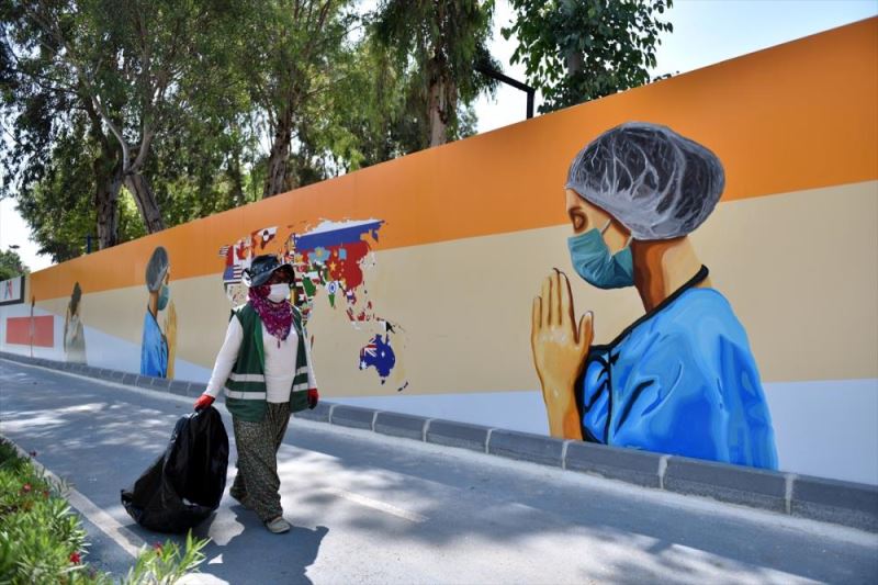 Sinemanin bulvara bakan duvarina Kovid-19 salginiyla mücadele eden saglik çalisanlarini yansitan hemsire görseli resmedildi.