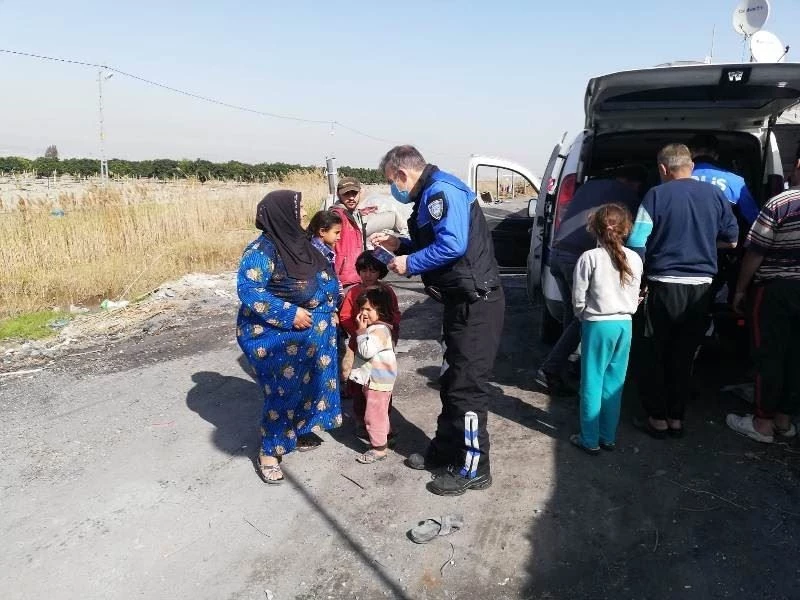 Mersin Emniyet Müdürlüğü’ne bağlı Toplum Destekli Polislik Şube Müdürlüğü personeli, mevsimlik tarım işçilerinin yaşadıkları alanları ziyaret ederek, sınırlı sayıda imkana sahip olan çocuklara kıyafet yardımında bulundu.