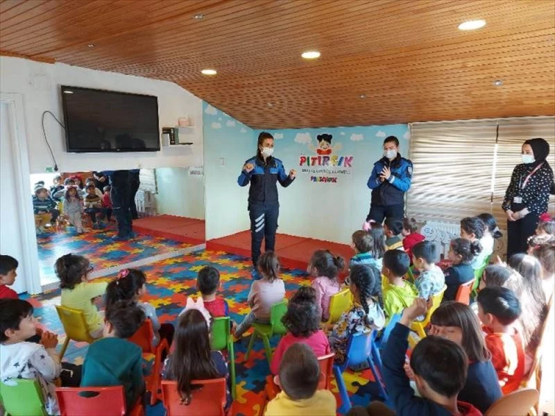 Toplum Destekli Polislik Şube Müdürlüğü ekipleri, kentteki iki anaokulunu ziyaret ederek çocuklara genel asayiş, trafik kuralları ve Kovid-19 tedbirleri konusunda bilgilendirmede bulundu.