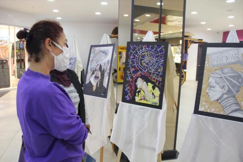 İlçedeki bir alışveriş merkezinde açılan sergide, öğretmenlerin kadına yönelik şiddeti tuvallere taşıdığı 20 eser yer aldı.