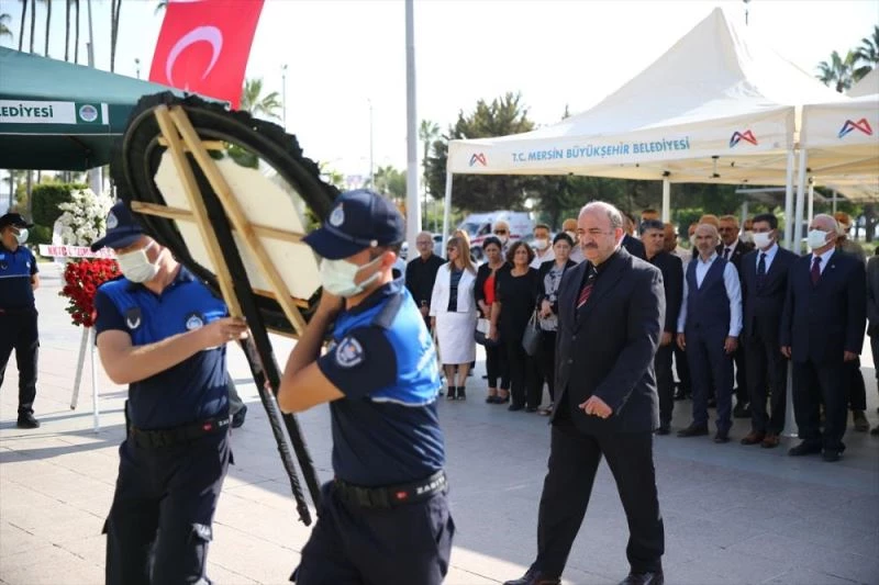 Akdeniz ilçesindeki Cumhuriyet Meydanı'nda düzenlenen törende, muhtar dernekleri adına İl Muhtarlar Derneği Başkanı Ali Gülgen ile Kuzey Kıbrıs Türk Cumhuriyeti (KKTC) Gazimağusa Muhtarlar Derneği Başkanı Mustafa Yesilleme, Atatürk Anıtı'na çelenk sundu.