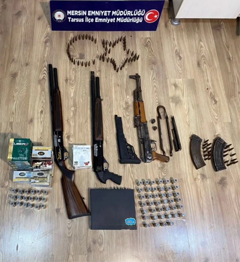 İl Emniyet Müdürlüğünden yapılan açıklamaya göre, Tarsus ilçe Emniyet Müdürlüğüne bağlı Asayiş Büro Amirliği ekipleri, yaptıkları çalışmalarda M.E. isimli şahısta uzun namlulu silah ve tüfek olduğu belirlendi. Bunun üzerine tespit edilen 2 adrese eş zamanlı operasyon düzenleyen ekipler, 1 AK-47 (kalaşnikof) marka uzun namlulu silah, 2 AK-47 şarjörü, 81 adet AK-47 fişeği, 1 AK-47 seyyar dipçik, 2 ruhsatsız av tüfeği, 348 av tüfeği fişeği, 1 dipçik, 1 güvenlik kamera kayıt cihazı ile 1 USB disk ele geçirdi.
