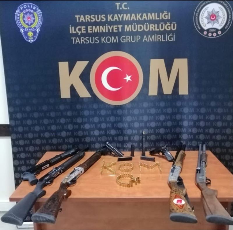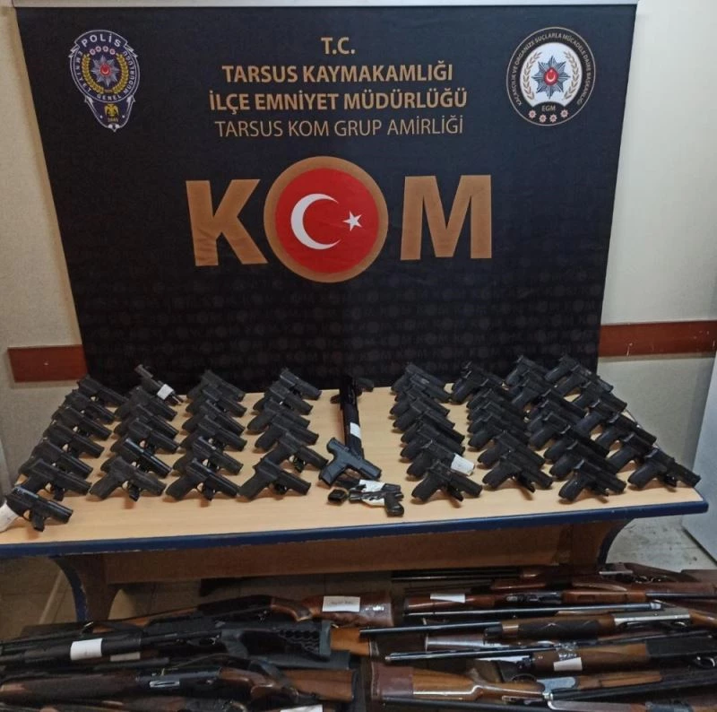 Emniyet Müdürlüğünden yapılan açıklamaya göre, Kaçakçılık ve Organize Suçlarla Mücadele Şube Müdürlüğü ekiplerince yürütülen çalışma kapsamında, Tarsus ilçesinde, silah ticareti suçu işledikleri, aracılık ettikleri ve bu suçu işleyen şahıslardan silah temin ettikleri tespit edilen şüphelilerin yakalanmasına yönelik 23 adrese eş zamanlı operasyon düzenlendi. Operasyonda, aranan 17 şüpheliden 13’ü gözaltına alınırken, adreslerde yapılan aramalarda; 7 adet ruhsatsız tabanca, 1 adet kuru sıkıdan dönme tabanca, 56 adet faturasız kuru sıkı tabanca, 28 ruhsatsız av tüfeği, 342 adet tabanca mermisi, 80 av tüfeği fişeği, 65 şarjör, 13 boş kovan, 3 adet silah üst kapak sürgüsü, 1 adet ayarlı silah gezi ve 30 kök Hint keneviri ele geçirildi.