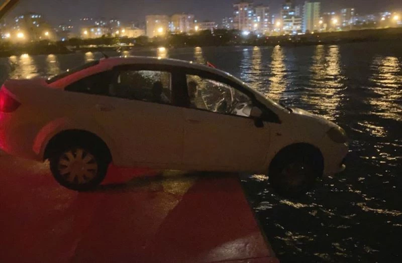 Mersin'de balıkçı barınağının iskelesinde askıda kalan otomobili itfaiye çıkardı