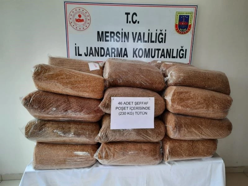 Mersin’in Tarsus ilçesinde jandarma ekiplerince şüphe üzerine durdurulan bir araçta gümrük kaçağı olduğu belirlenen 230 kilo tütün ele geçirildi.